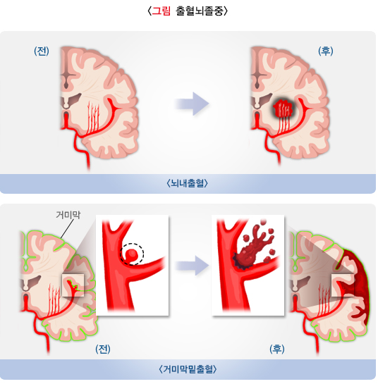 뇌출혈에는 뇌내출혈과 거미막밑출혈 등이 있는데요.