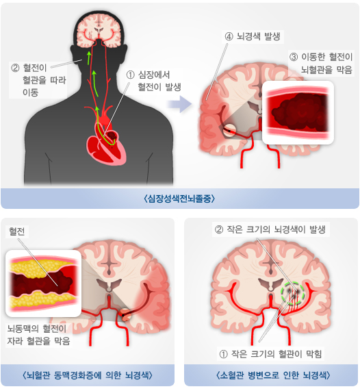 즉 심장에서 혈전이 발생하고, 이 혈전이 혈관을 따라 이동하다가, 작은 뇌혈관을 막게 되면 뇌경색이 발생합니다.