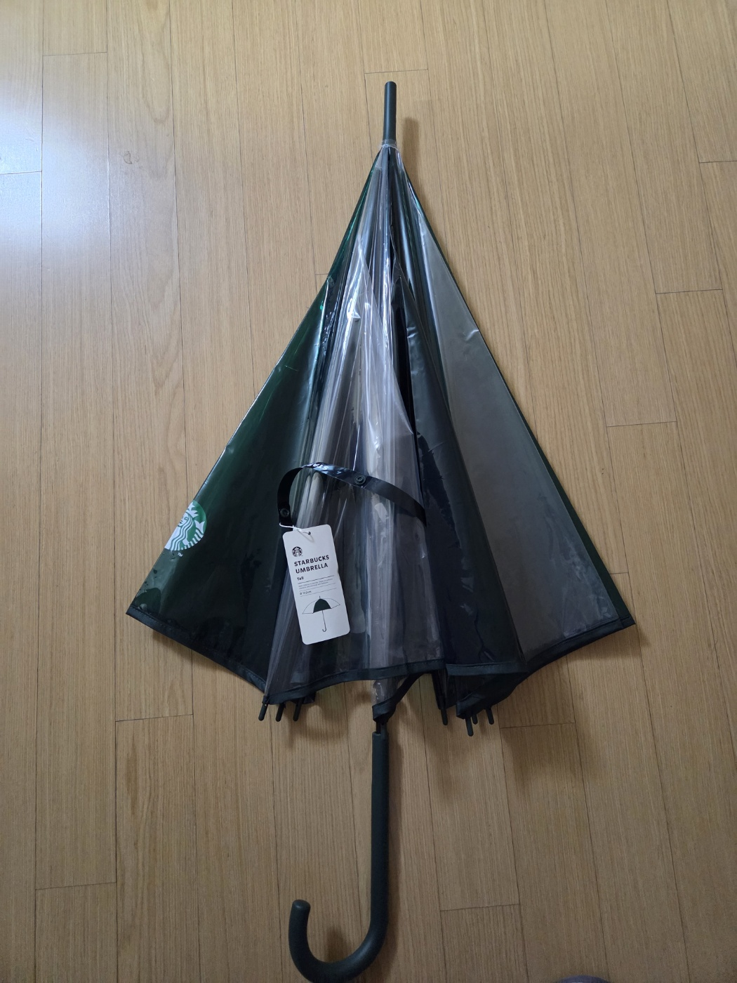펼쳐서 보면 스타벅스 로고가 있는 투명우산입니다.