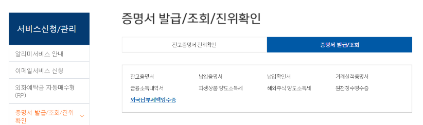 메뉴는 고객서비스 - 증명서 발급 - 외국납부세액 조회/출력 메뉴에서 확인할 수 있습니다.