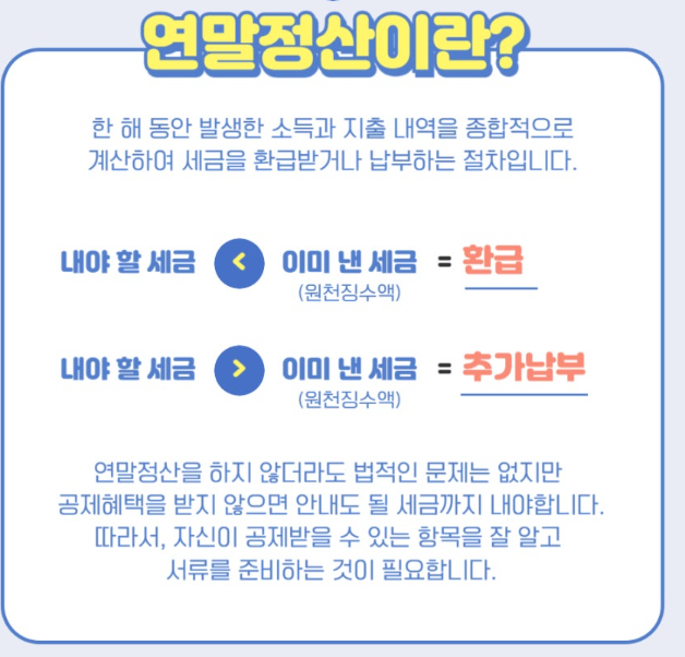 매월 급여에서 원천징수된 소득세가 실제 납부해야 할 세금보다 많거나 적을 경우, 그 차액을 연말에 정산해 환급을 받거나 추가 납부하게 됩니다..