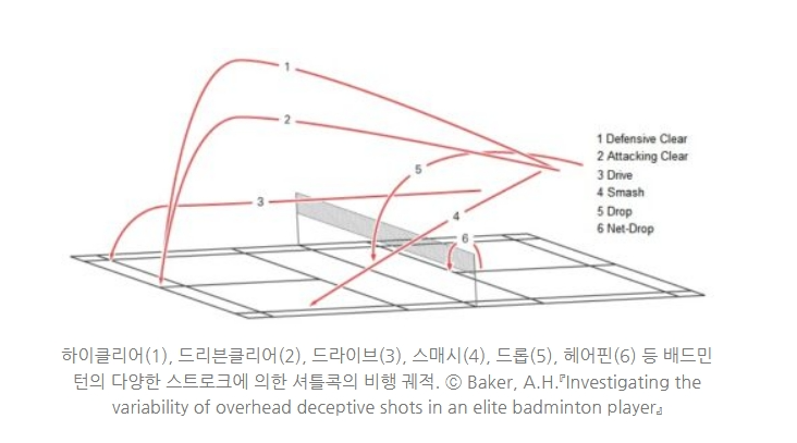 배드민턴의 가장 기본적인 6개의 궤적중에서 1,2번입니다.