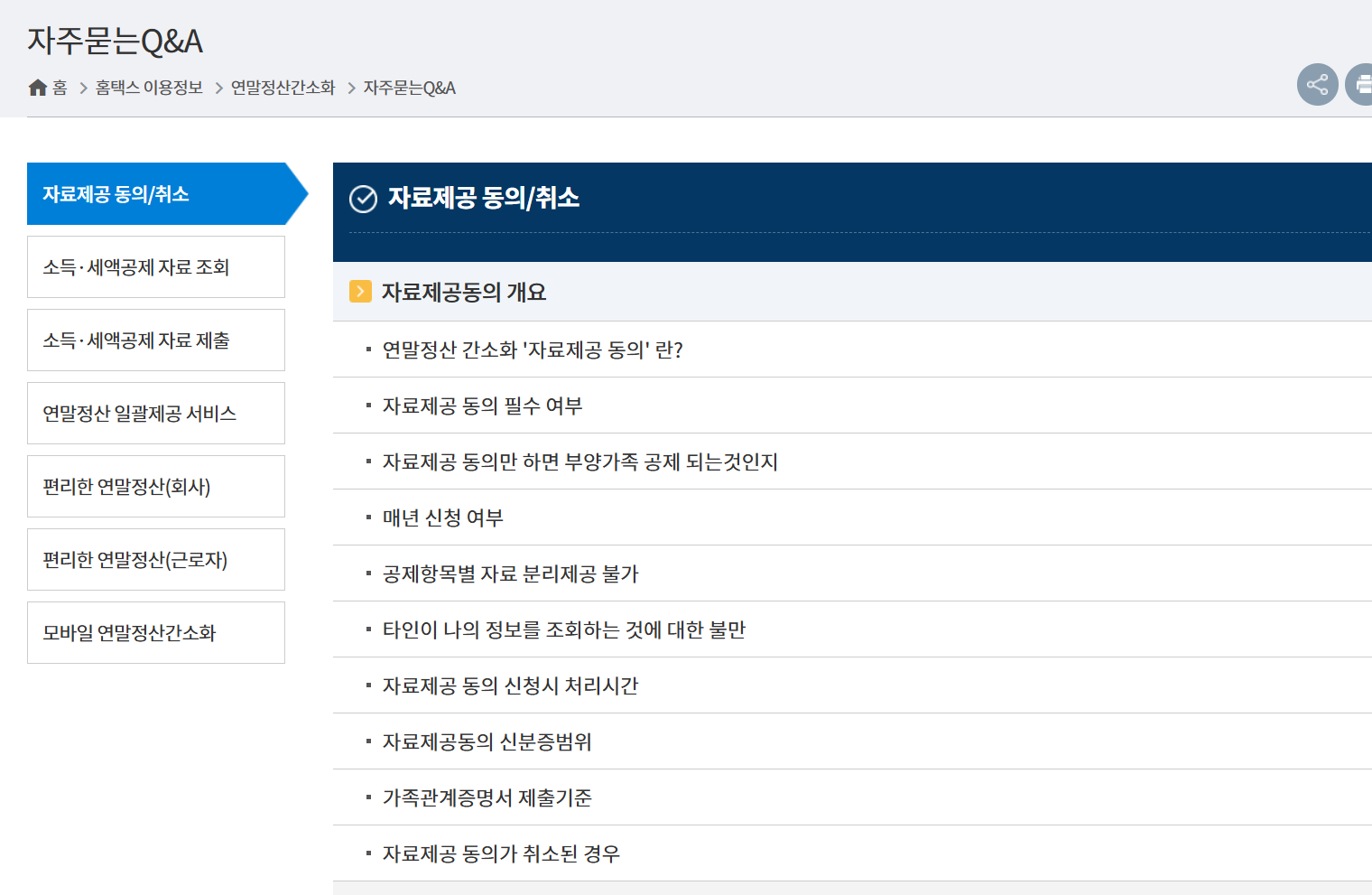 그리고 [자료제공동의] 란 근로자가 연말정산 간소화서비스를 통해 부양가족의 소득.세액공제 자료를 조회하기 위해서는 사전에 가족의 동의가 있어야 하는데, 이 절차를 "자료제공동의" 라고 한다고 합니다.
