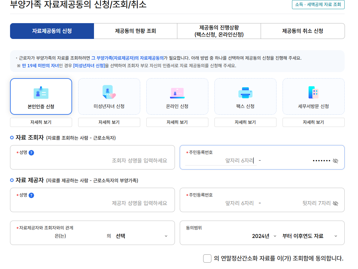 자료조회하고자 하는 본인의 정보를 넣고, 하단에 자료 제공하는 부양가족의 정보를 넣고 동의범위를 2019년 이후부터 받아올 수 있는데요.