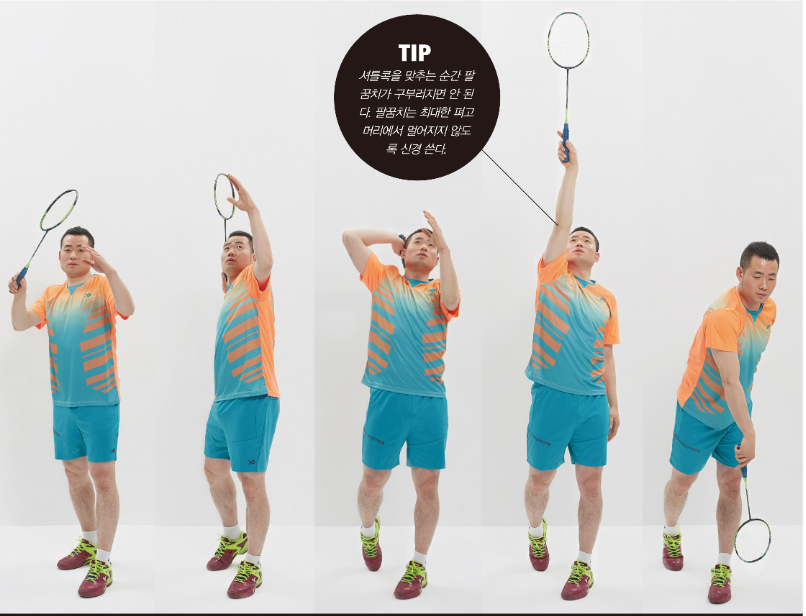 하이클리어를 치기 위해서는 백 스윙이 필요하다. 효과적인 백 스윙을 하기 위한 하이클리어 준비 자세를 만들어 보자. 라켓을 들고 있는 발을 다른 발 뒤로 ㄴ자 가 되게 만들고, 가슴과 어깨를 열어준다. 라켓을 들고 있지 않은 팔을 높은 곳에서 오는 볼을 향하도록 높게 들어주고, 라켓 을 들고 있는 팔은 팔꿈치를 구부려 어깨 선과 일치하게 90도를 만들어 준다.