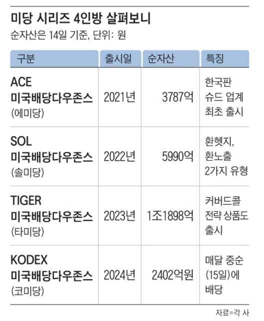 거기에다가 최근에는 미당이라는 용어도 생겼는데요. 바로 미국 + 배당의 줄임말로 매달 배당을 주는 상품을 말합니다. 미국배당다우존스가 가장 대표적인데요. 이름을 붙여서 에미당, 솔미당, 타미당, 코미당이라고 불립니다.