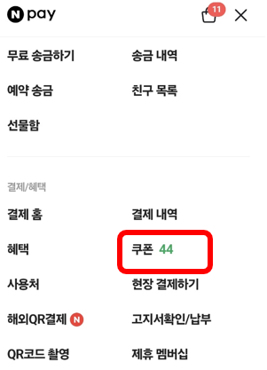 네이버페이 쿠폰을 등록하려면 네이버페이 전체 메뉴에서 결제/혜택 -> 쿠폰 메뉴로 들어갑니다.