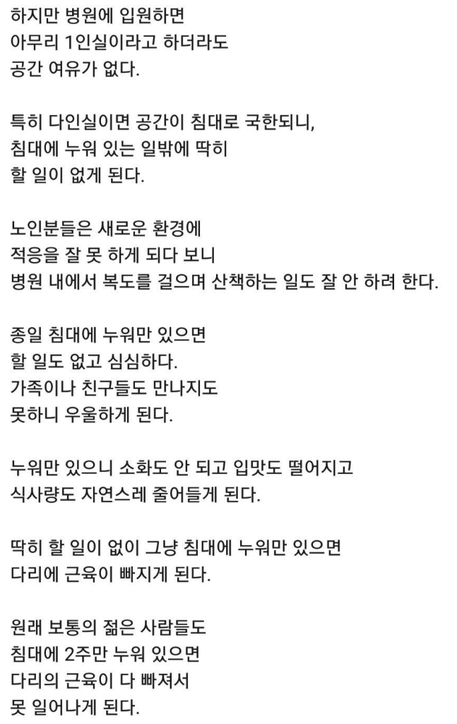 병원 침대에 가만히 누워만 있는 것은 어르신들에게 치명적입니다.