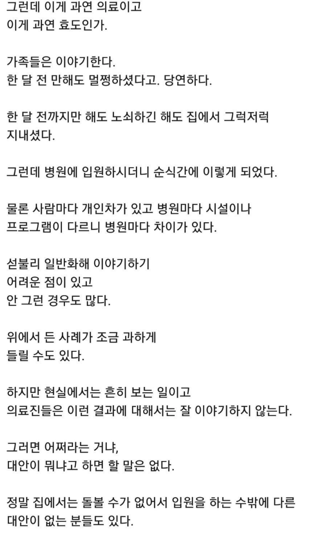 라는 점을 강조하는 것입니다. 어르신들은 환경 변화에 매우 취약하기 때문에, 입원을 결정할 때는 실보다 득이 큰지 냉정하게 판단해야 한다는 조언입니다.
