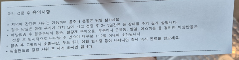 접종후에는 간단한 샤워는 가능하나 음주나 운동을 삼하라고 합니다.