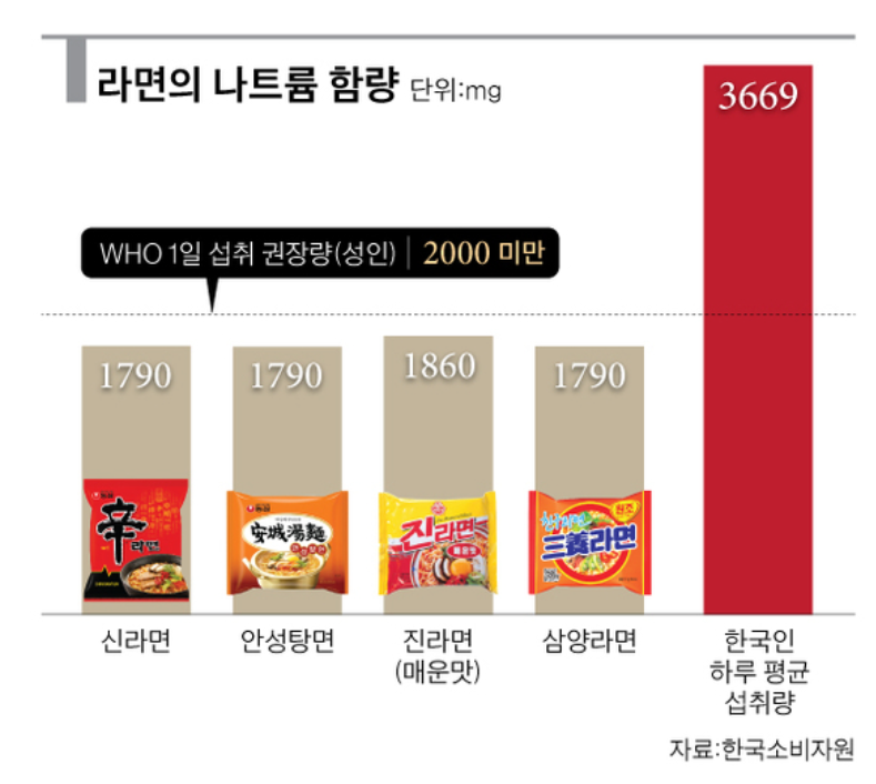 그리고 라면하면 매번 언급되는 나트륨이 있습니다. 라면 국물에는 나트륨 함량이 높아 자주 먹을 경우 신장(콩팥)에도 좋지 않다. 식품의약품안전처에서 권고한 하루 나트륩 섭취량은 2000mg인데, 라면은 한 개당 평균 1700에서 1800mg사이의 나트륨이 들어있는 것으로 알려져 있습니다. 즉 라면 한 개만 먹더라도 1일 나트륨 권장 섭취량의 80%를 소비하게 되는 것인데요. 라면을 먹고 국물에 밥까지 말아먹으면 나트륨 과다 섭취에 탄수화물까지 과잉 섭취해 혈당스파이크가 올 수 있다고 합니다.