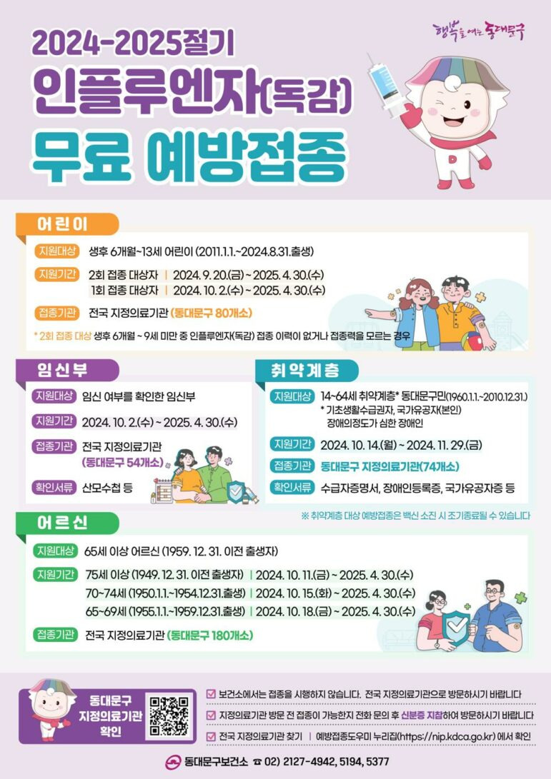 어린이, 임산부, 취약계층, 어르신에 대해서는 무료로 접종이 가능합니다. 접종 대상은 인플루엔자 감염 시 중증으로 이어질 위험이 큰 생후 6개월~13세 어린이, 임신부, 65세 이상 어르신으로 주소지와 관계없이 접종 가능합니다.