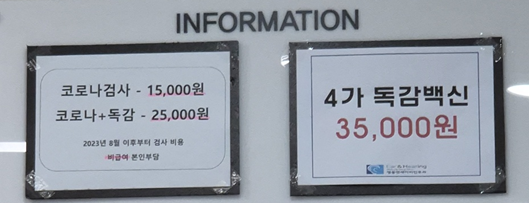 병원에 갔더니 4가 독감백신은 35,000원에 접종하고 있었습니다. 옆에 코로나와 독감 검사는 25,000원 수준이었습니다.