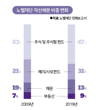 노벨의 유산은 현재 주식/헤지/사모펀드/채권/부동산에 포트폴리오를 가지고 투자하고 있는데요. 이에 수익금으로 상금을 지급하고 있습니다. 그러다 보니 물가상승률 등을 반영한 상금의 실질가치는 1901년을 100%로 볼 때 1919년(28%)이 가장 낮았고, 2001년(144%)에 가장 높았습니다. 1919년은 1차 세계대전 직후 유럽이 초토화된 시기입니다. 2001년은 세계적인 ‘닷컴 열풍’ 직후 주가가 고평가됐던 시기이기도 ㅎ합니다. 지난해 상금의 실질가치는 103%로 첫 해와 비슷한 수준이니다.