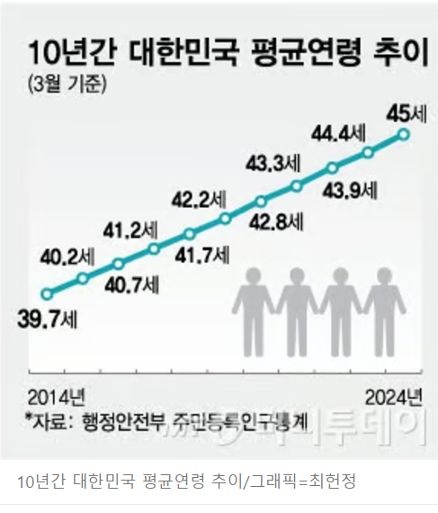 무엇보다 정말 고령화 사회가 되어간다는게 느껴지는게 평균 연령이 가파르게 상승하고 있습니다. 45세라니.. 너무 빠르네요.
