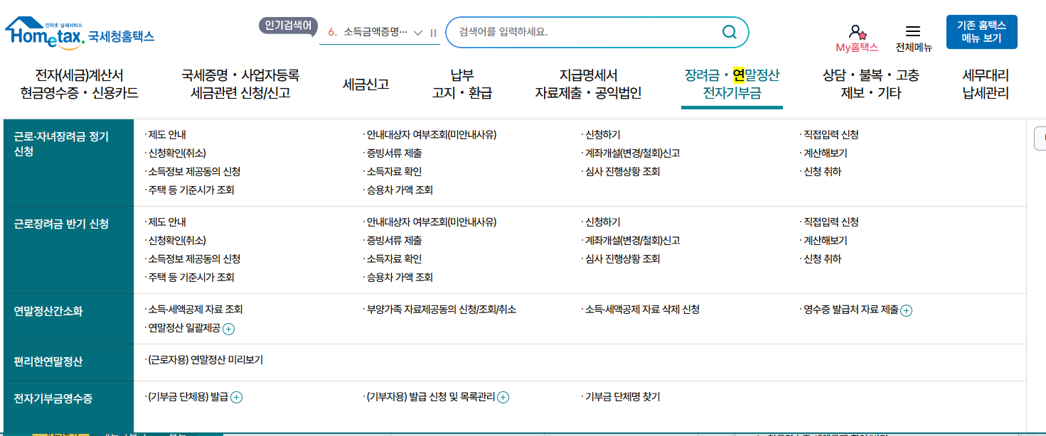 먼저 홈텍스 사이트에 들어가서 메인의 장려금/연말정산/전자 기부금 메뉴에 들어갑니다.