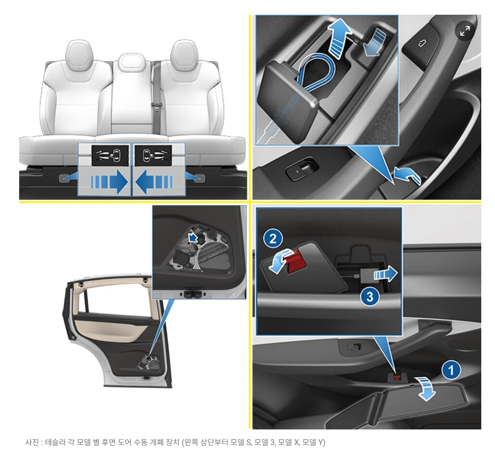 기본적으로 전기차의 경우 사고로 전원이 끊기면 차량 문을 여는 버튼이 작동하지 않을 수 있는 문제가 있습니다. 이런 경우 수동 개폐 장치를 이용해 수동으로 문을 열어야 하는데요.