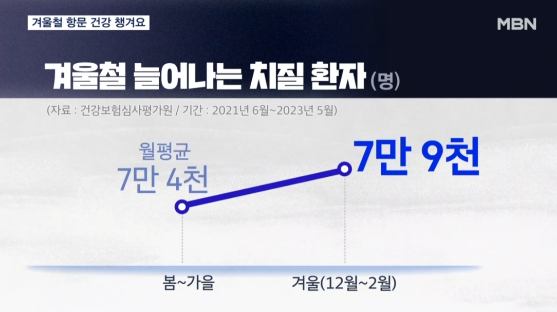 실제로 통계를 살펴보더라도 봄가을보다는 겨울에 평균 환자가 7만 9천명으로 평소보다 5천명이나 더 많이 발생합니다.