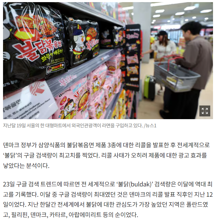 덴마크 정부는 올해 6월, 국내 라면 제조사 삼양식품의 ▲핵불닭볶음면 3X스파이시 ▲핵불닭볶음면 2X스파이시 ▲불닭볶음탕면 등 3개 제품을 현지 시장에서 회수(리콜)조치했습니다. 당시 리콜 사유는 해당 제품들에 캡사이신 수치가 높아 '급성 중독 위험'이 있다는 게 이유였습니다.