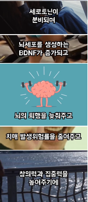 뇌 세포 역시 뇌 세포를 생성하는 BDNF가 증가하여 뇌의 퇴행을 늦춰주고, 치매 발생 위험률을 낮춰 준다고 합니다.