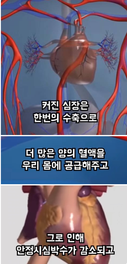 이렇게 커진 심장은 한번의 수축으로 더 많은 혈액과 영양분을 몸으로 보내줍니다.