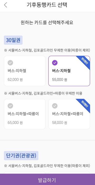 이후 교통카드의 경우 30일권을 선택하고 청년할인이 가능하면 청년할인을 선택하시면 됩니다.