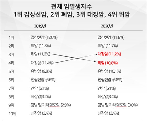 이번 통계에 따르면 대한민국의 암 발생 순위는 아래와 같습니다.