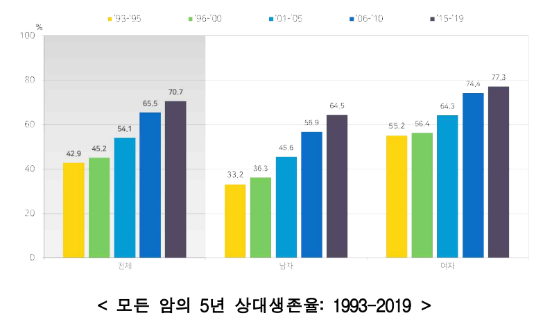2020년 5년 상대 생존율은 71.5%로 10년 전과 비교해 6%포인트 증가했습니다.