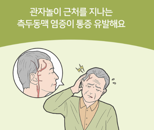 염증이 심하거나 혈액이 뭉쳐 덩어리(혈전)을 형성하면 혈관이 튀어나오면서 딱딱하게 만져지거나 혹처럼 보이기도 하는데요. 대부분 노인에서 나타나는 질환으로, 50세 이상에서 이전에 없던 관자놀이 통증이 지속된다면 측두동맥염을 의심해 볼 수 있습니다.