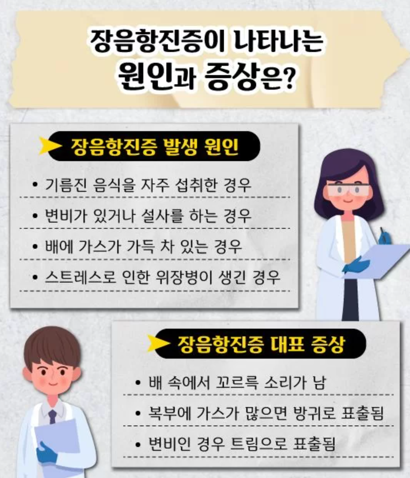 의학적으로 배에서 ‘꼬르륵’ 소리가 나는 것은 위장의 연동 운동이 잘되지 않아 생기는 ‘장음항진증(長音亢進症)'에 의한 것일 가능성이 있습니다. 장음항진증은 일반적으로 장에 공기가 많이 찼을 때 흔히 나타납니다.