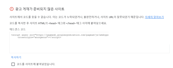아래와 같이 광고 게재가 준비되지 않은 사이트라며 에러가 발생하였습니다.
