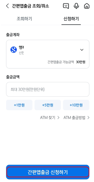 신한 쏠앱에서 ATM 또는 간편앱출금을 선택합니다.