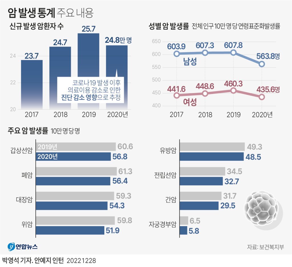 보건복지부와 중앙암등록본부는 국가암등록통계사업을 통해 수집한 2020년 국가암등록통계와