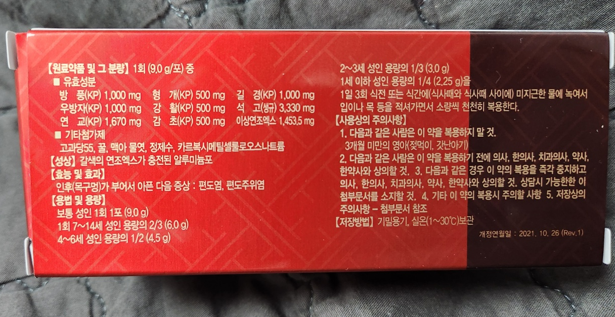 앞서 살펴본것처럼 방풍, 형개, 길경, 우방자, 강활, 석고, 연교, 감초가 들어있습니다.
