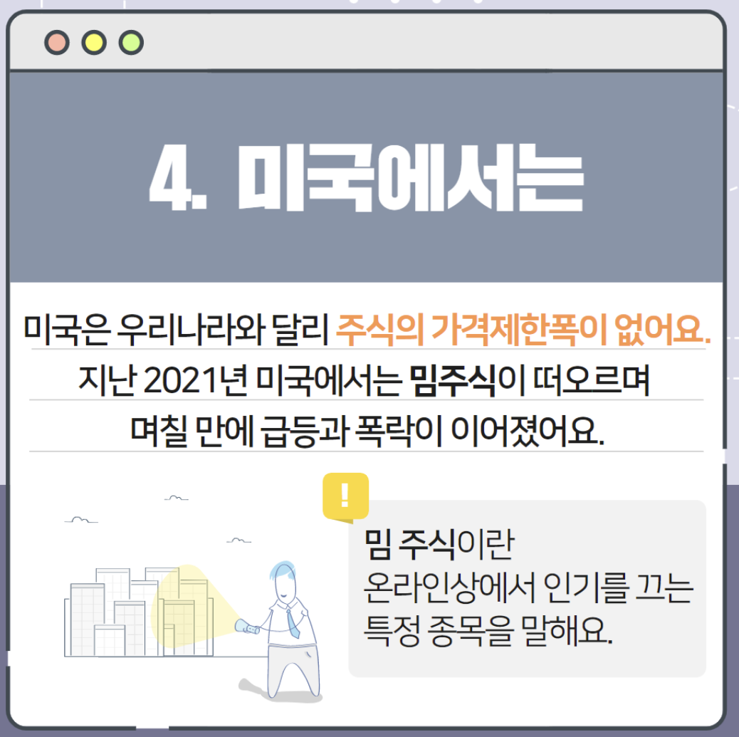 주가의 급격한 변동으로 인한 투자자의 혼란과 피해를 방지하기 위해 주가 변동 폭을 제한했습니다. 2015년부터 코스피시장, 코스닥시장은 전날 종가보다 30% 이상, 코넥스시장은 15% 이상 오르거나 내리지 않도록 규정해 놓았습니다.