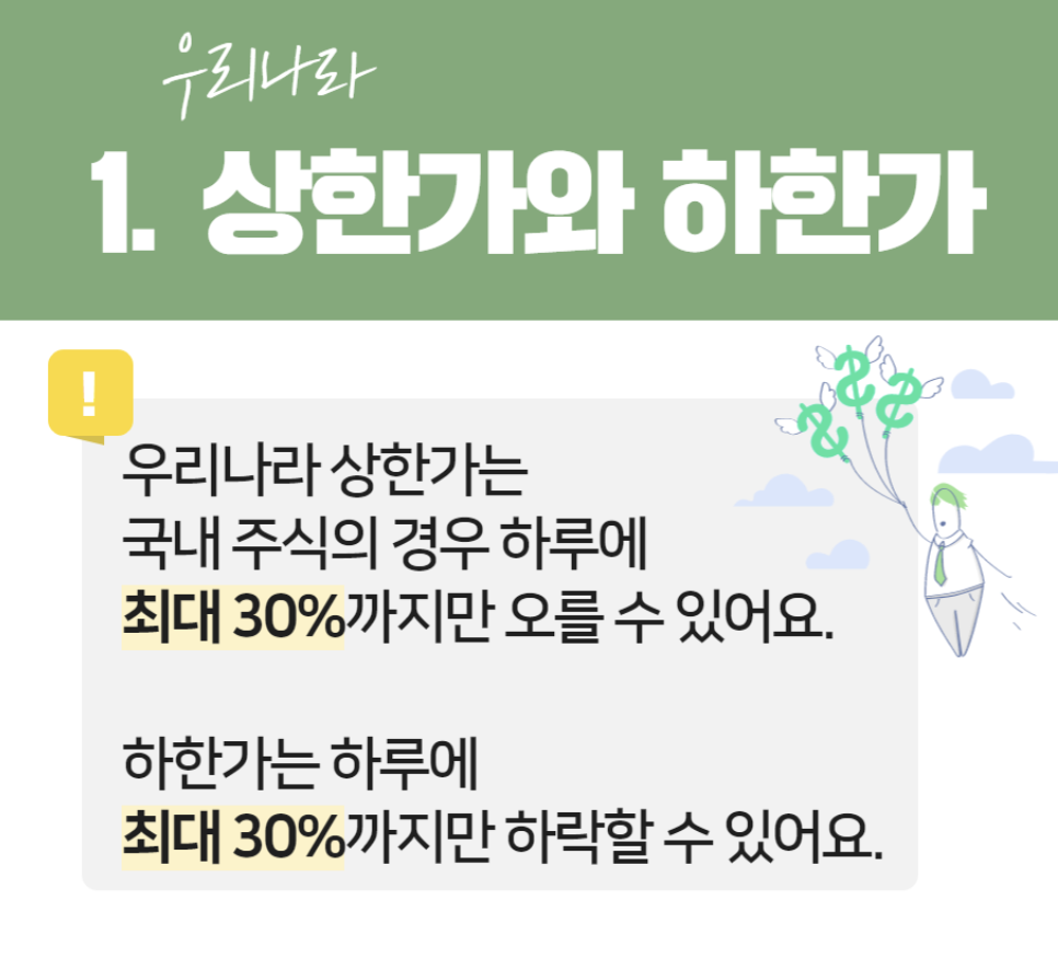 주식시장에서 개별 종목의 가격이 하루 동안 오르거나 내릴 수 있는 가격 제한 폭을 의미하는데요. 상한가는 전일 종가 기준으로 오를 수 있는 최대 금액이고, 하한가는 하루 동안 주가가 하락할 수 있는 가장 낮은 금액을 의미합니다.