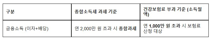 | 기본 구조 | 이자+배당소득이 연 2천만 원을 넘으면다른 소득과 합쳐서 최대 49.5% 세금 부과 |