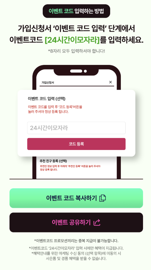 실제로 가입해보니 편리하게 가입을 할 수 있었습니다. 코드만 24시간이모자라라고 넣어주면 됩니다.