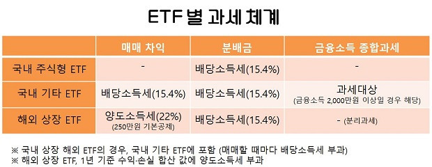 국내 주식형은 매매차익에 대한 세금이 없지만, 국내 상장 해외 ETF나 해외상장 ETF는 매매차익에 대한 세금이 있으니 이를 참고하시기 바랍니다.
