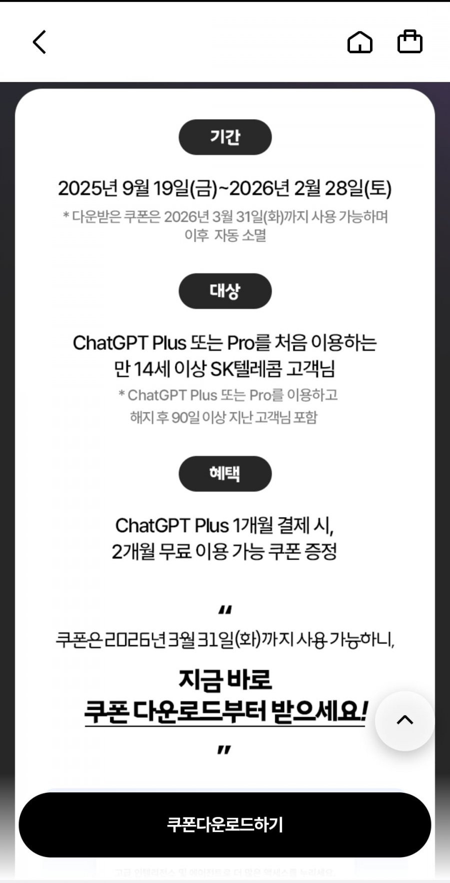 쿠폰 다운로드 후 연결되는 페이지에서 회원가입 또는 로그인 후 ChatGPT Plus를 결제하면 된다고 합니다.
