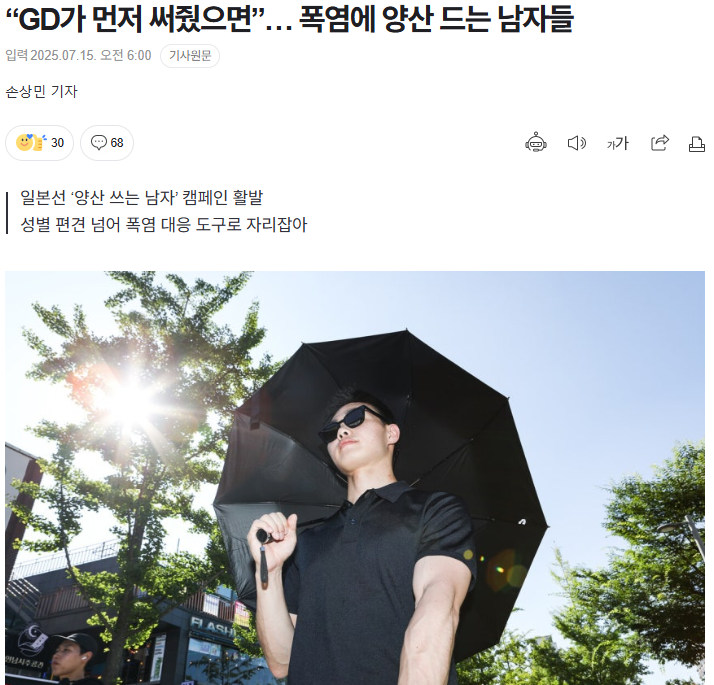 이에 따라 서울에서도 남성들의 양산 사용이 조금씩 늘고 있습니다 .이에 "유명인 중 GD(지드래곤)처럼 유행을 선도하는 사람이 양산을 쓰면 문화가 확산될 것 같다"라고 말하는 사람들이 있는데요.