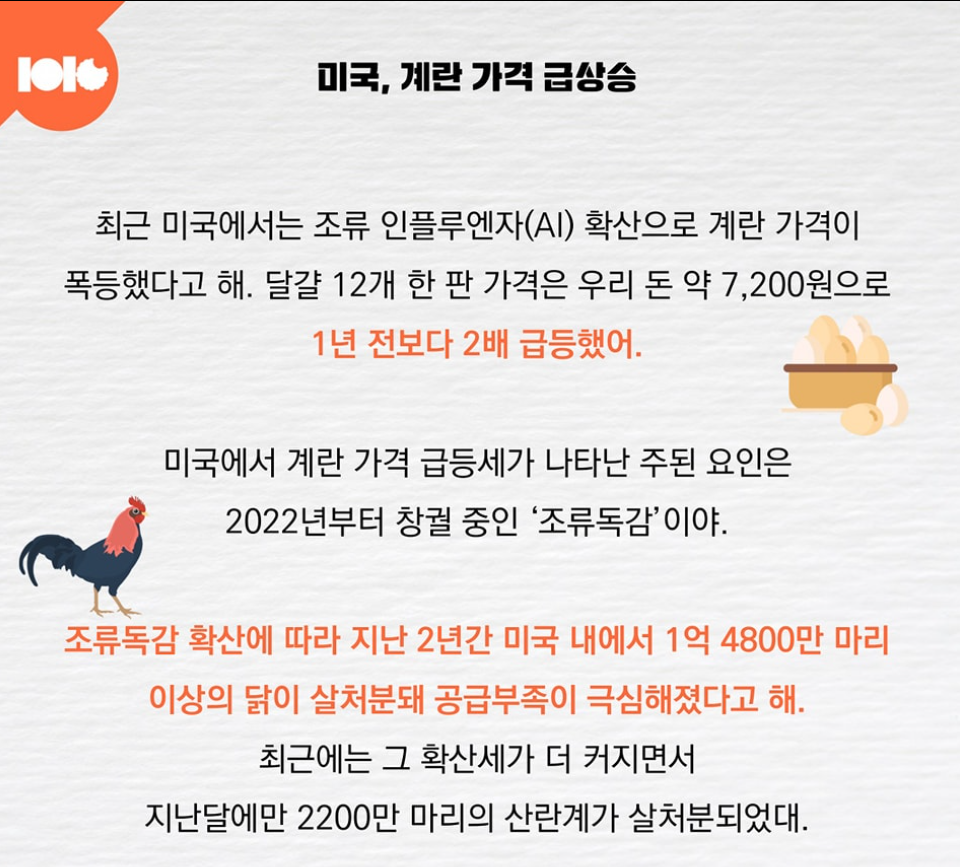 미국 계란 가격이 급상승한 것은 조류 인플루엔자 확산으로 닭을 살처분해서 그런데요