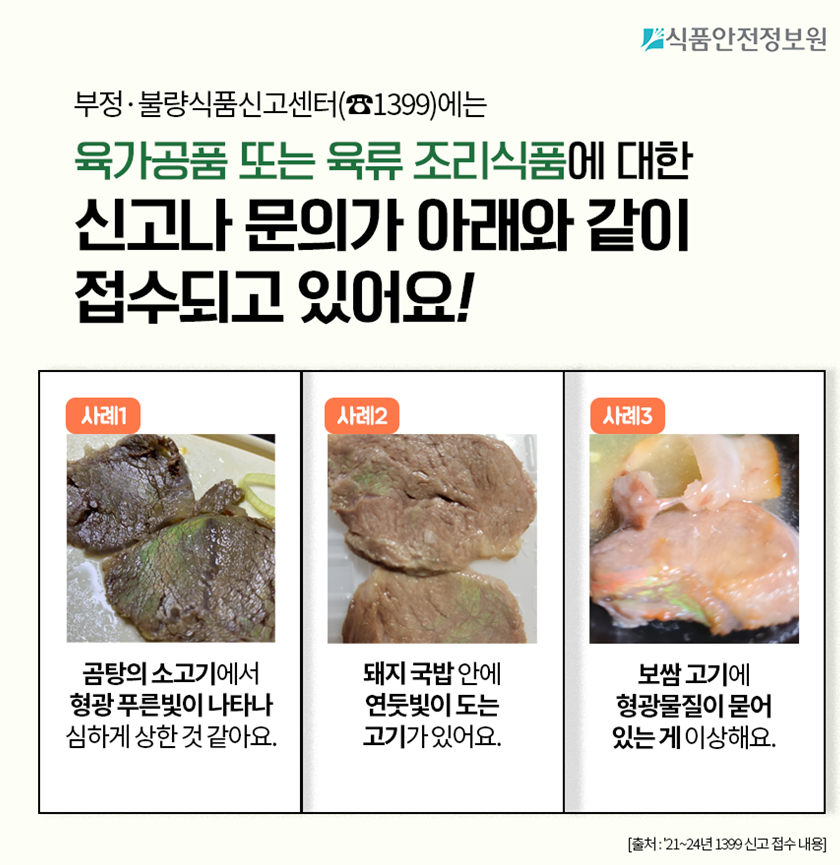 색깔만 형광색이 아니라 고기에서 상한 냄새와 맛이 나거나 끈적한 질감이 느껴진다면 먹지 않아야 합니다.