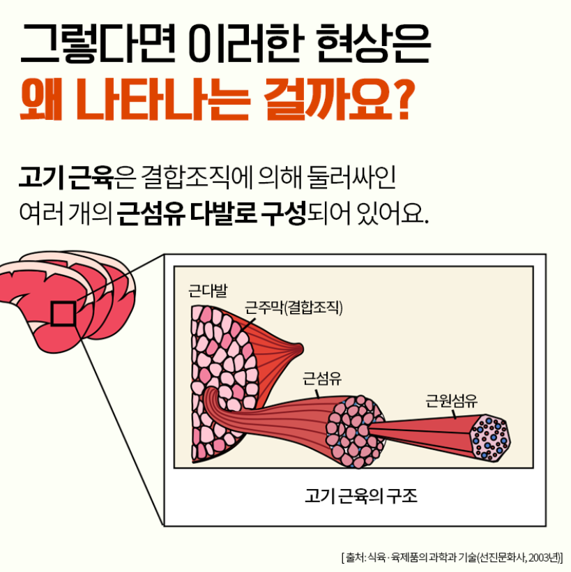 기본적으로 고기 근육은 결합조직에 의해 둘러싸인 여러 개의 근섬유 다발로 구성되어 있는데요.