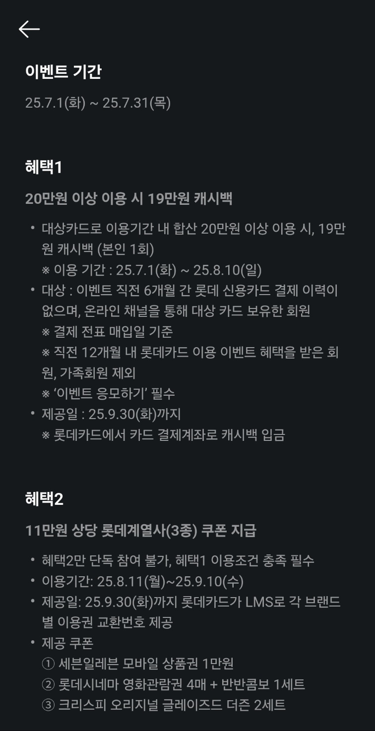 롯데멤버스 롯데카드인데요. 20만원 이상 사용시 19만원 캐시백입니다.