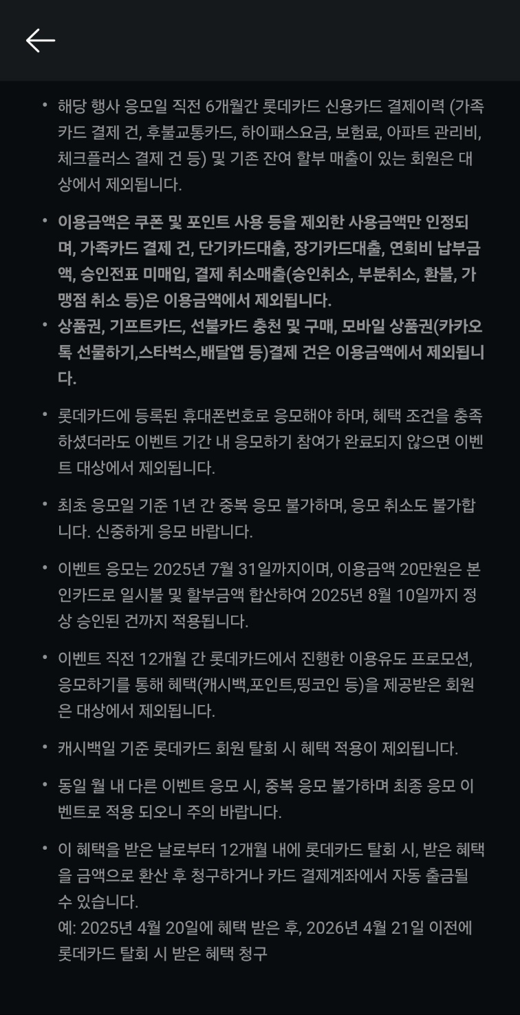대상은 이벤트 직전 6개월간 롯데 신용카드 결제 이력이 없으며, 직전 12개월 내 롯데카드 이용 이벤트 혜택을 받으면 안됩니다.